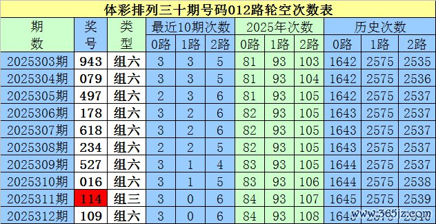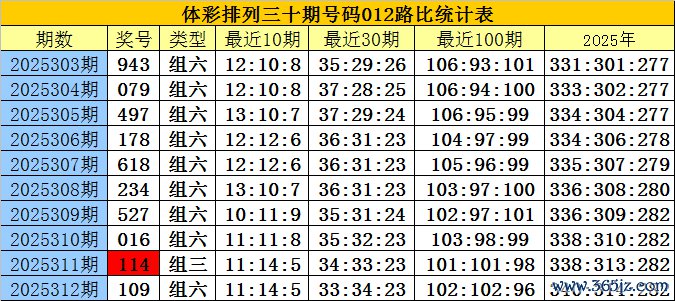 开奖回顾:成列三第2025312期奖号为:109,号码012路比为2:1:0。